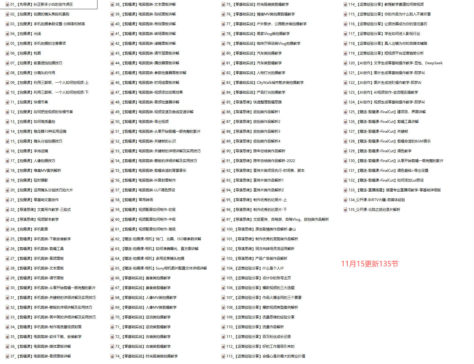 ├──97_【导演思维】文旅宣传、自驾游、自驾Vlog、旅拍类作品解析.mp4 141.02 - ├──100_【导演思维】原创剧情类作品解析-象山.mp4 69.07M