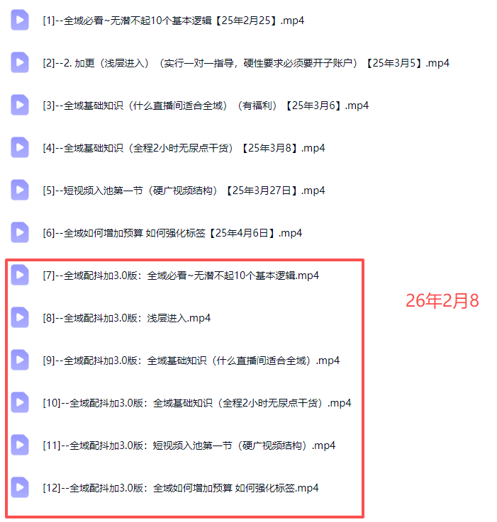├──[9]–全域配抖加3.0版:全域基础知识(什么直播间适合全域).mp4 75.13M - ├──[10]–全域配抖加3.0版:全域基础知识(全程2小时无尿点干货).mp4 226.62M